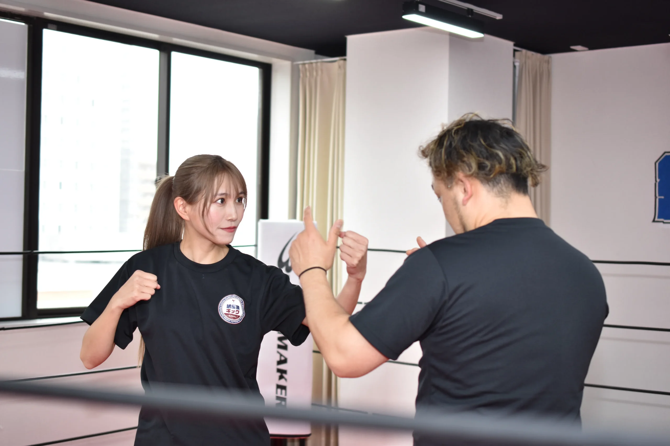 鏡の前で、トレーナーと一緒に、パンチやガード、フックなど基本の動作を練習します。